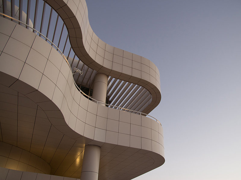 The Getty Center, named for J. Paul Getty, sits high on a hill at the edge of the Santa Monica Mountains with incredible views of Los Angeles. This large site contains a museum, a research institute, and a beautiful garden. The buildings are of a modern design that incorporates natural light and creates unique outdoor spaces.